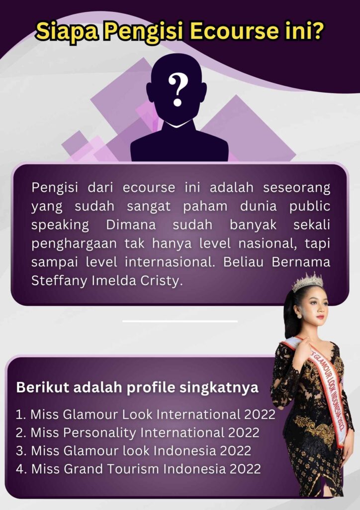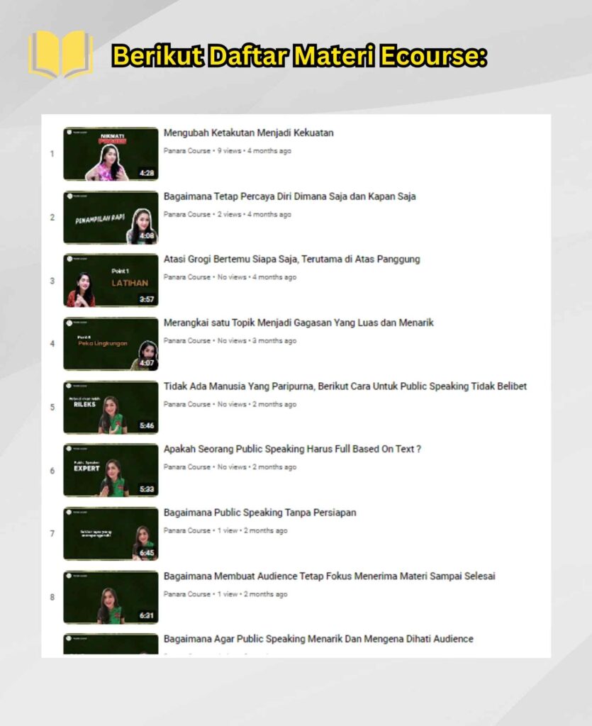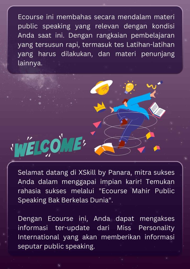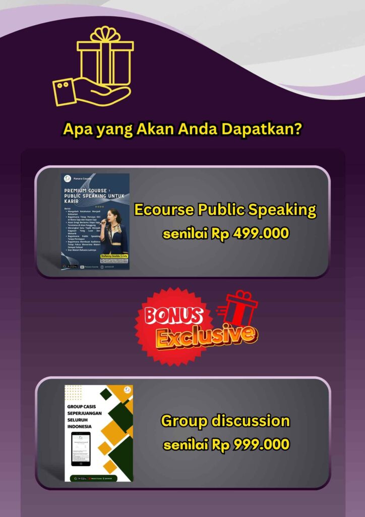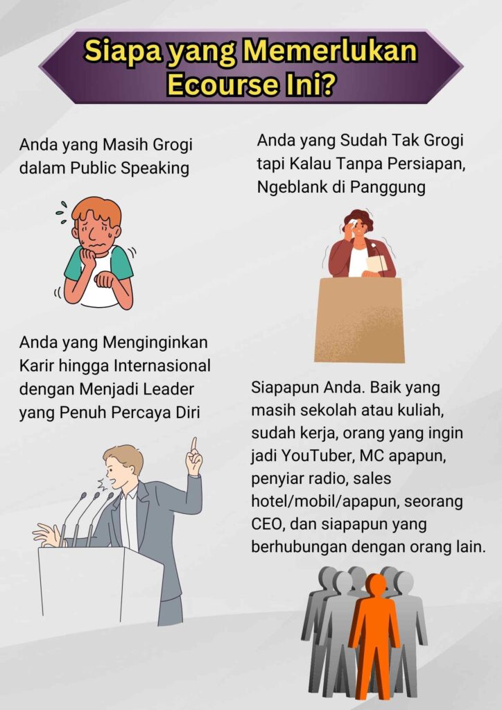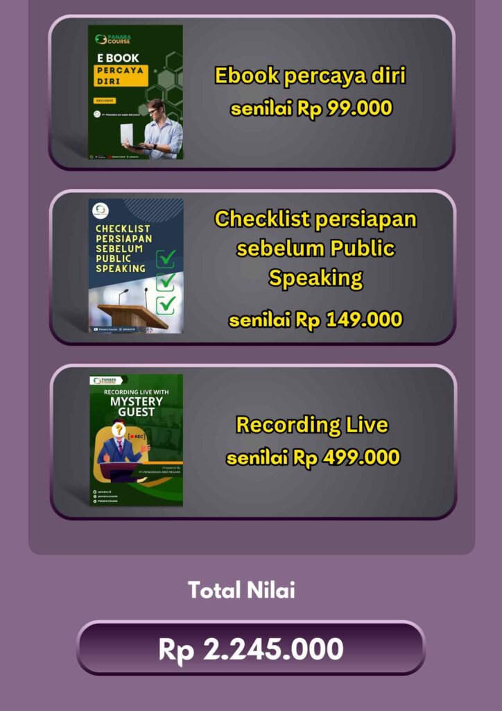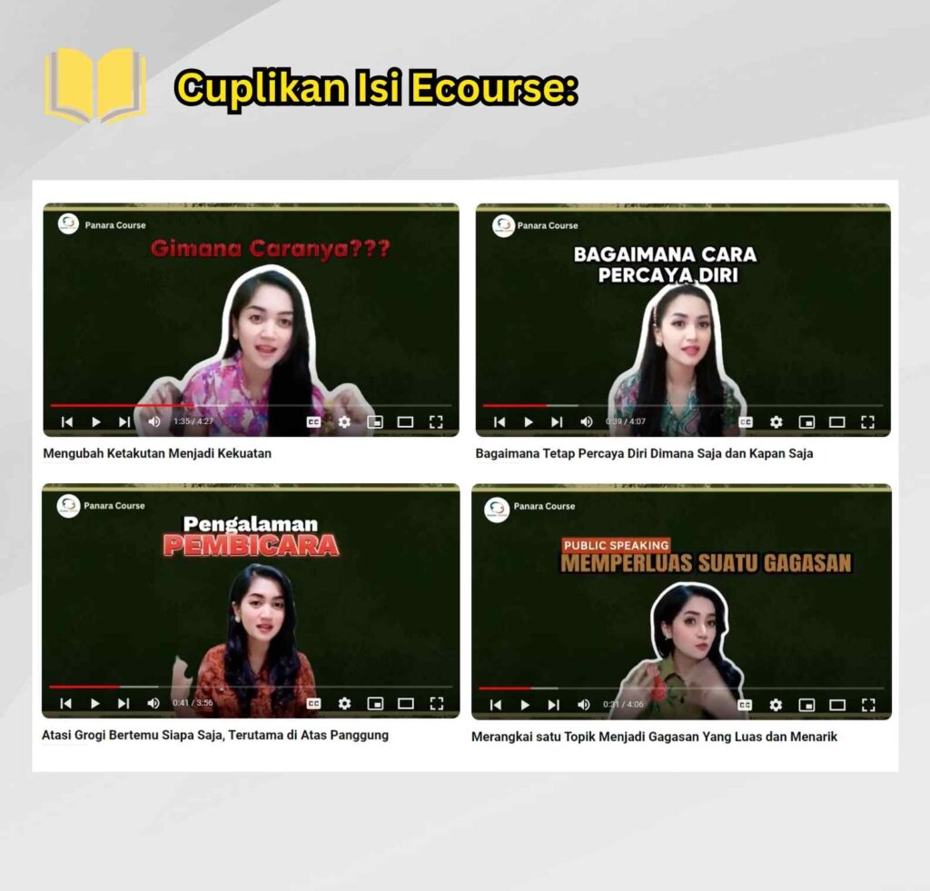 Ecourse ini memberikan panduan lengkap dan tersusun rapi untuk mengatasi grogi panggung dan prakteknya serta diisi oleh master public speaking kelas dunia